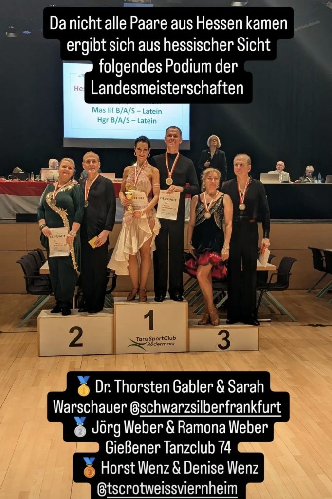 In der Master III B Latein waren dann 6 Paare angetreten. Horst und Denise konnten mit einem starken Cha Cha (Platz 2) und eine tollen Samba (Platz 3) schlussendlich den 5. Platz insgesamt sichern. Da auch hier nicht alle Paare aus Hessen kamen waren sie aus hessischer Sicht Vizelandesmeister 2025.