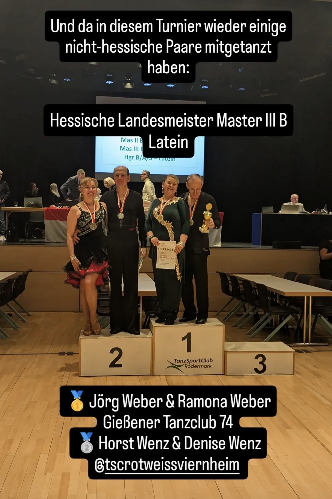 Der Hessische Tanzsportverband lud zu den hessischen Landesmeisterschaften Masters II/III und Hauptgruppe B/A/S-Latein in die Kulturhalle Rödermark ein. Vom RWV gingen Horst und Denise gleich in 2 Wettbewerben an den Start.